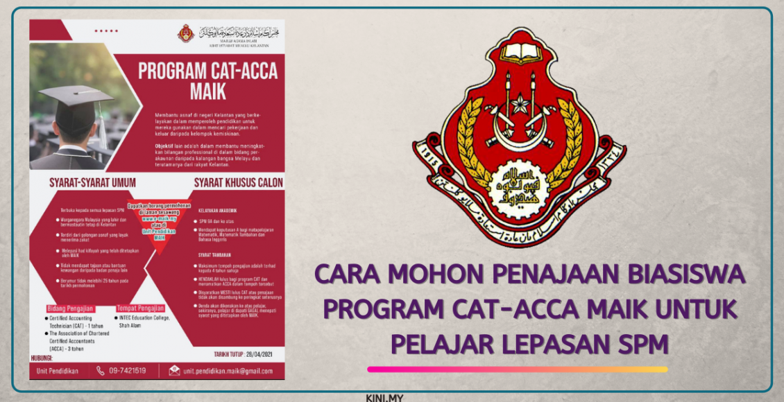 Asnaf negeri Kelantan terutamanya pelajar lepasan SPM dipelawa untuk memohon biasiwa untuk mengikuti Program CAT-ACCA Majlis Agama Islam Kelantan (MAIK) dan permohonan boleh dibuat secara online.