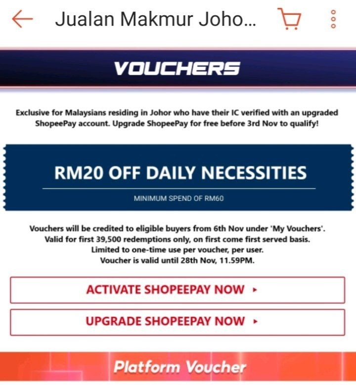 Dengan pengunaan baucer Jualan Makmur Johor tersebut, Shopee menawarkan pembelian barang keperluan minimum RM60 dalam satu resit malah mendapat potongan sebanyak RM20 di Shopee dan menawarkan penghantaran secara percuma ke rumah anda.