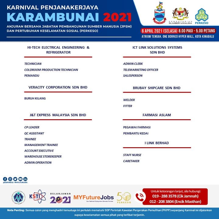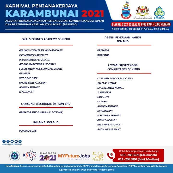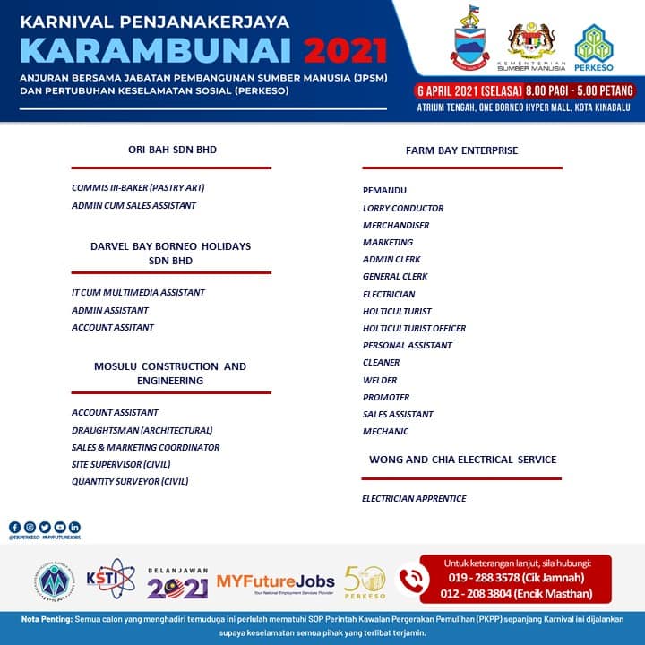 PERKESO negeri Sabah akan menganjurkan Karnival PenjanaKerjaya Karambunai 2021 di Kota Kinabalu dan mengalu-alukan semua pencari kerja di negeri Sabah untuk mendaftar seterusnya menghadirkan diri untuk sesi temuduga dan seterusnya.