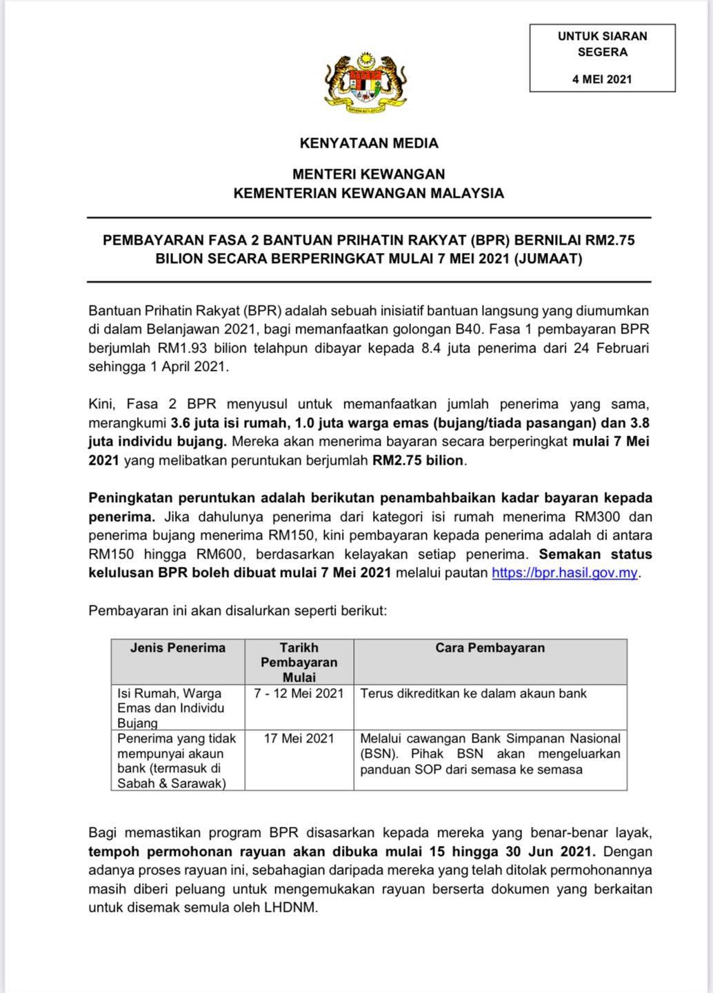 Menurut kenyataan oleh Lembaga Hasil Dalam Negeri (LHDN), bayaran BPR Fasa Kedua dijangka akan dibuat bermula hujung April dan awal Mei kepada semua penerima.