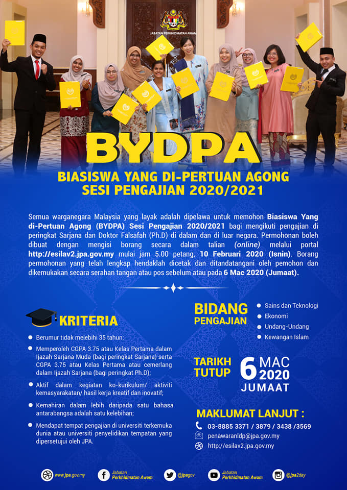 Jabatan Perkhidmatan Awam (JPA) mempelawa mana-mana mereka yang layak bagi memohon Biasiswa Yang Di Pertuan Agong (BYDPA) bagi sesi pengajian 2020/2021. Tawaran ini dibuka bagi peringkat pengajian Sarjana dan Doktor Falsafah di dalam dan luar negara.