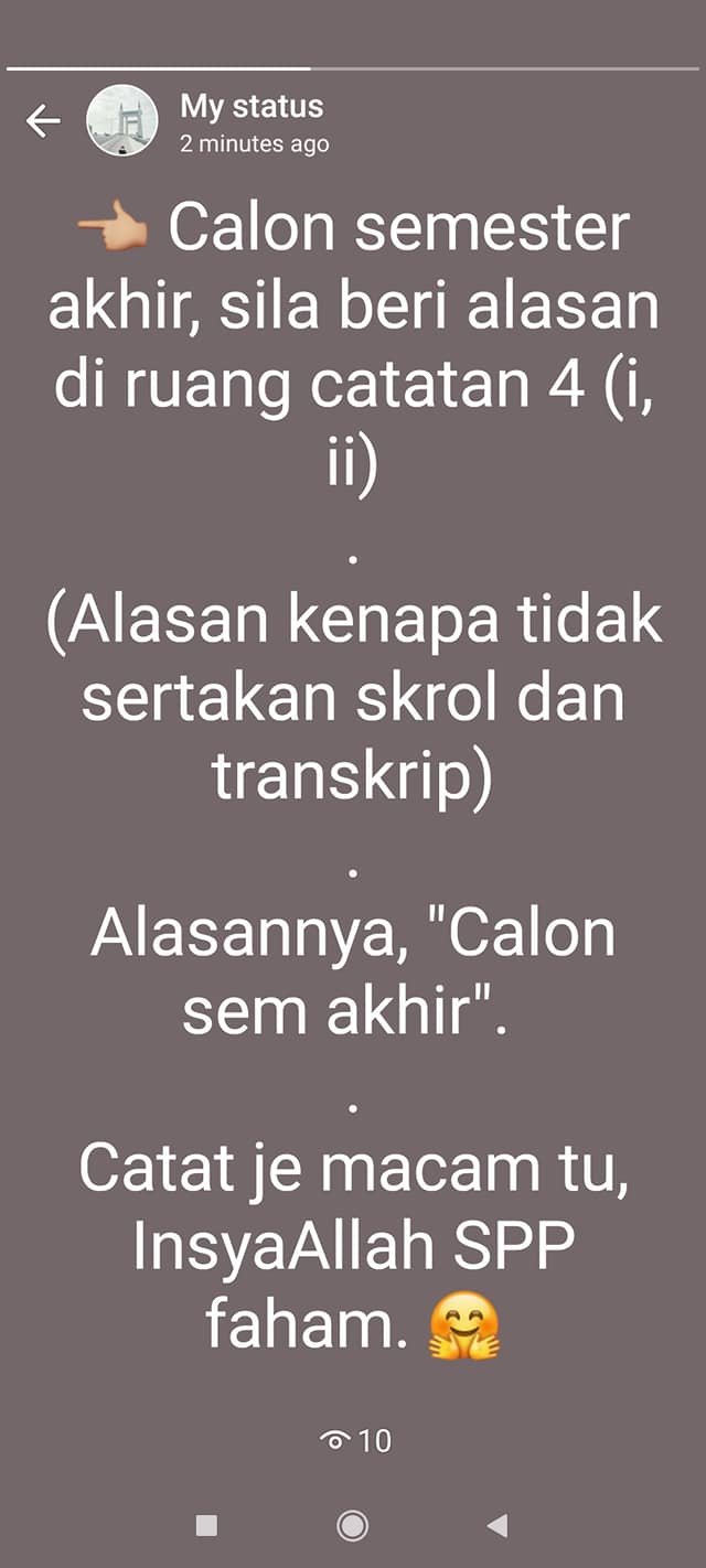 Apakah alasan kenapa tidak sertakan skrol dan transkrip bagi calon semester akhir yang ingin menghantar permohonan?