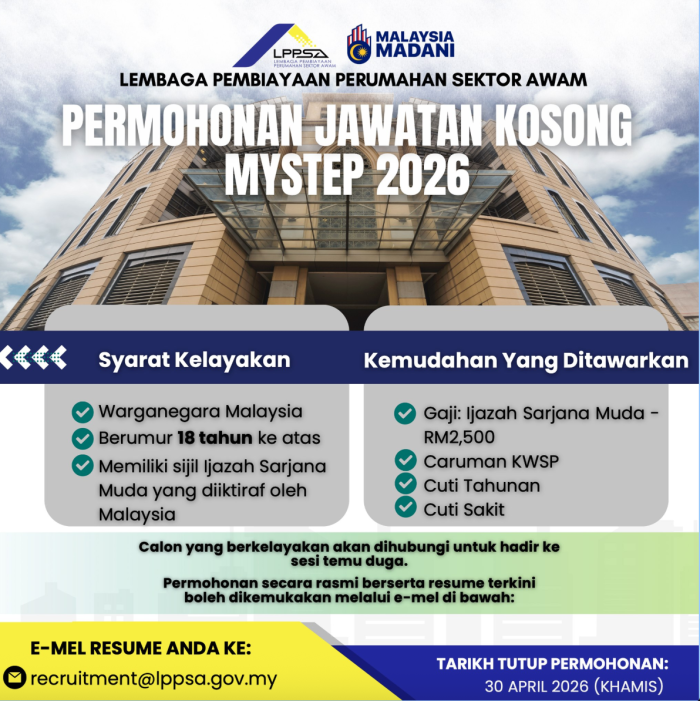 Lembaga Pembiayaan Perumahan Sektor Awam (LPPSA) kini membuka permohonan MySTEP 2026 kepada warganegara Malaysia berkelayakan. Permohonan dibuat melalui email dan tarikh tutup adalah 30 April 2026 (Khamis).