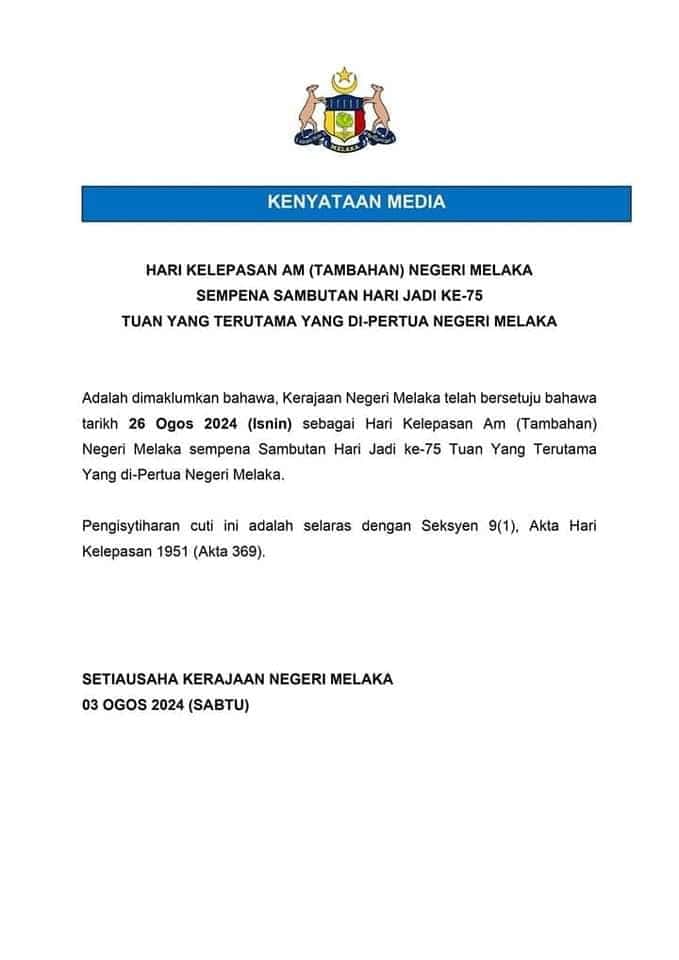 Kerajaan Negeri Melaka dengan sukacitanya mengumumkan bahawa Isnin, 26 Ogos 2024, akan diisytiharkan sebagai Hari Kelepasan Am Tambahan bagi seluruh Negeri Melaka. Cuti tambahan ini diberikan sempena sambutan Hari Jadi ke-75 Tuan Yang Terutama (TYT) Yang di-Pertua Negeri Melaka, satu perayaan yang mempunyai makna besar buat seluruh rakyat negeri ini.