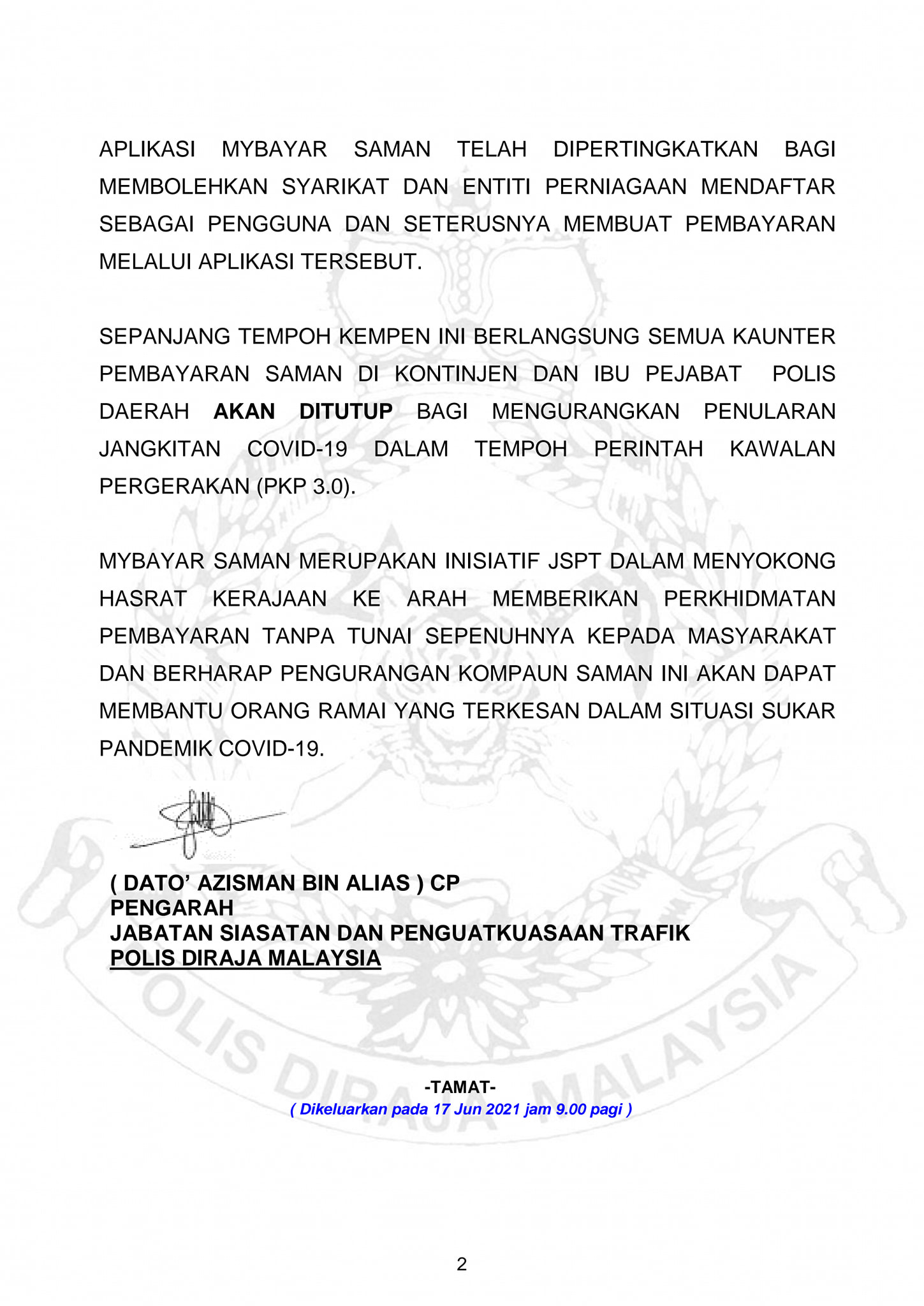 Berikut adalah kenyataan media yang dikeluarkan oleh PDRM berhubung diskaun saman trafik sebanyak 50% mulai 18 Jun sehingga 18 Julai 2021.