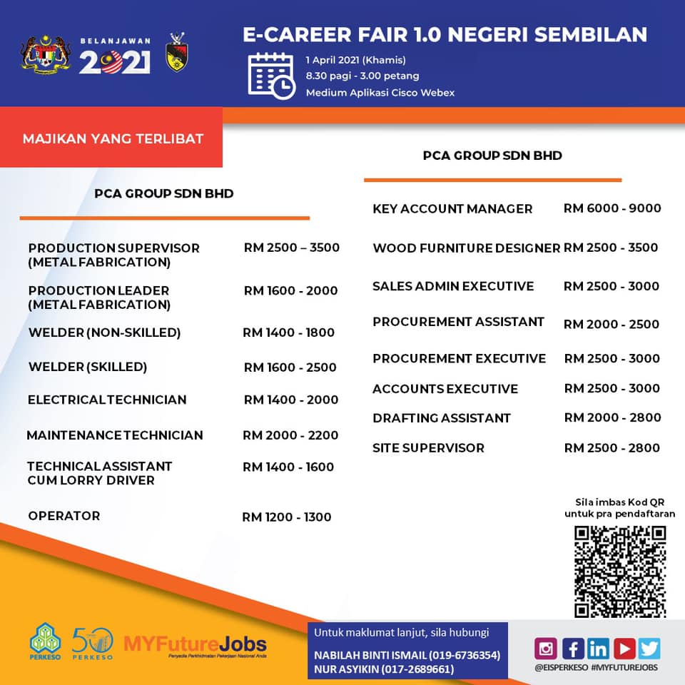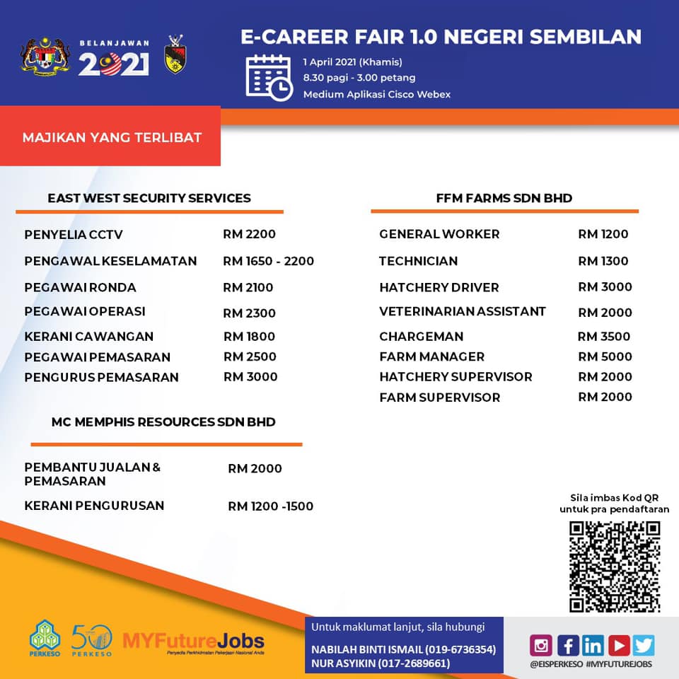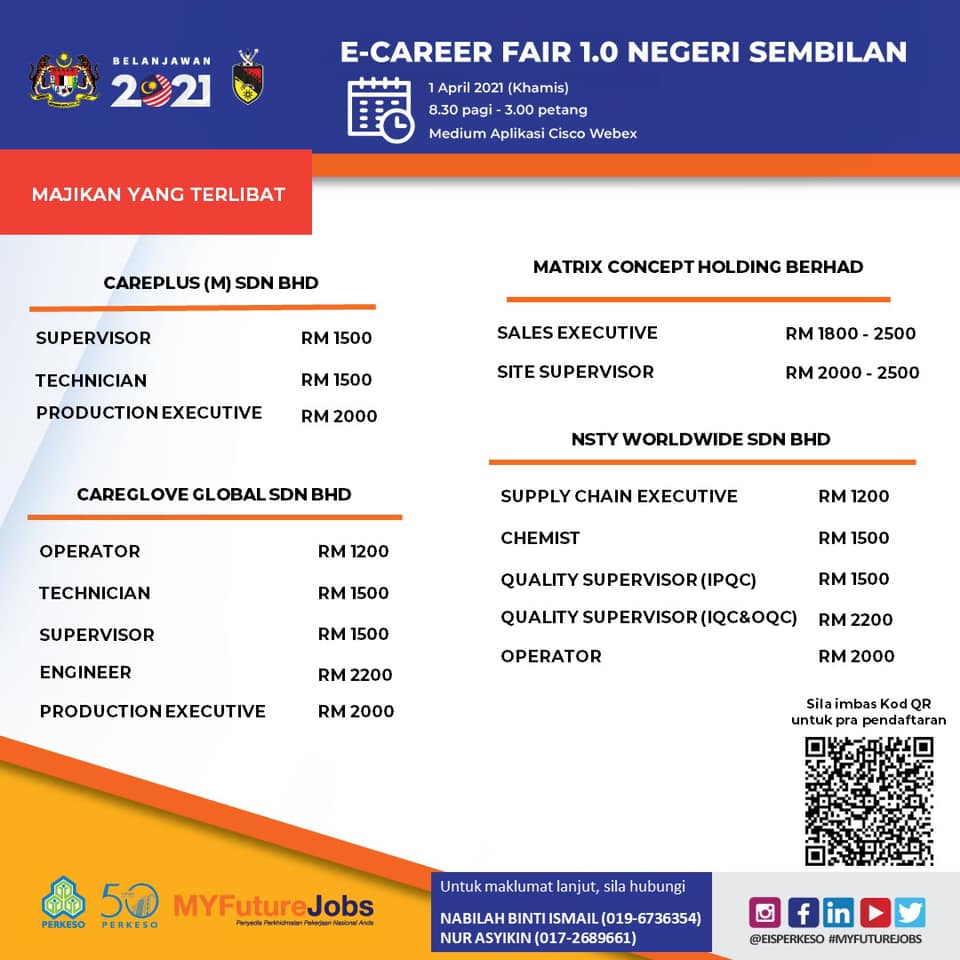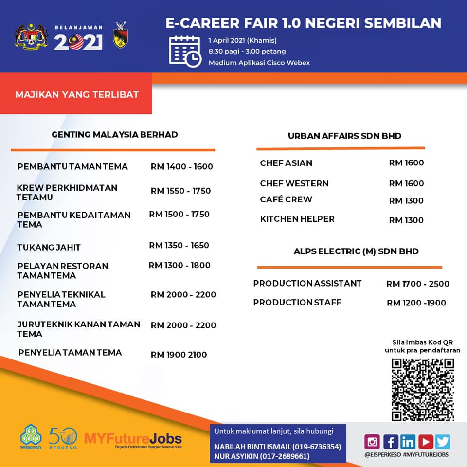 Ingin mendapatkan pekerjaan dalam masa yang terdekat? Jika ya, anda dipelawa untuk mengikuti temuduga terbuka e-Career Fair 1.0 Peringkat Negeri Sembilan 2021 yang dianjurkan oleh PERKESO.