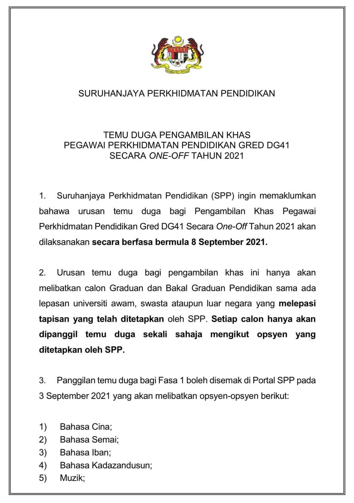 Untuk makluman anda, urusan temuduga untuk jawatan Guru One-Off DG41 juga akan diadakan secara berfasa bermula 8 September 2021 dan mengikut opsyen yang telah ditetapkan. Sudah bersediakah anda?
