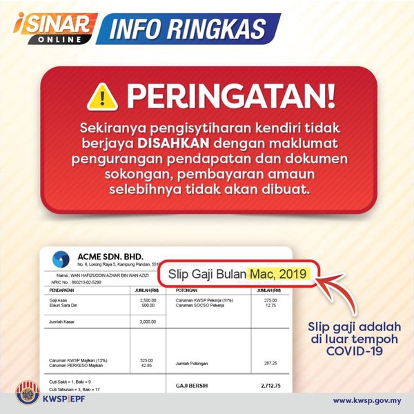 Slip gaji yang berada di luar tempoh Covid-19 tidak relevan untuk permohonan pengeluaran iSinar Kategori 2.