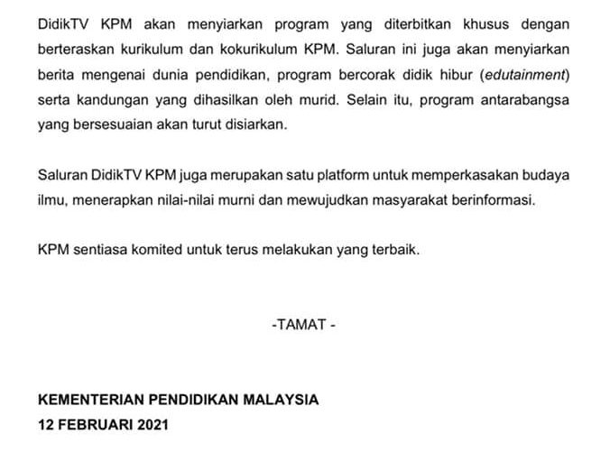 Berikut adalah kenyataan media daripada Kementerian Pendidikan Malaysia mengenai DidikTV KPM untuk rujukan anda.