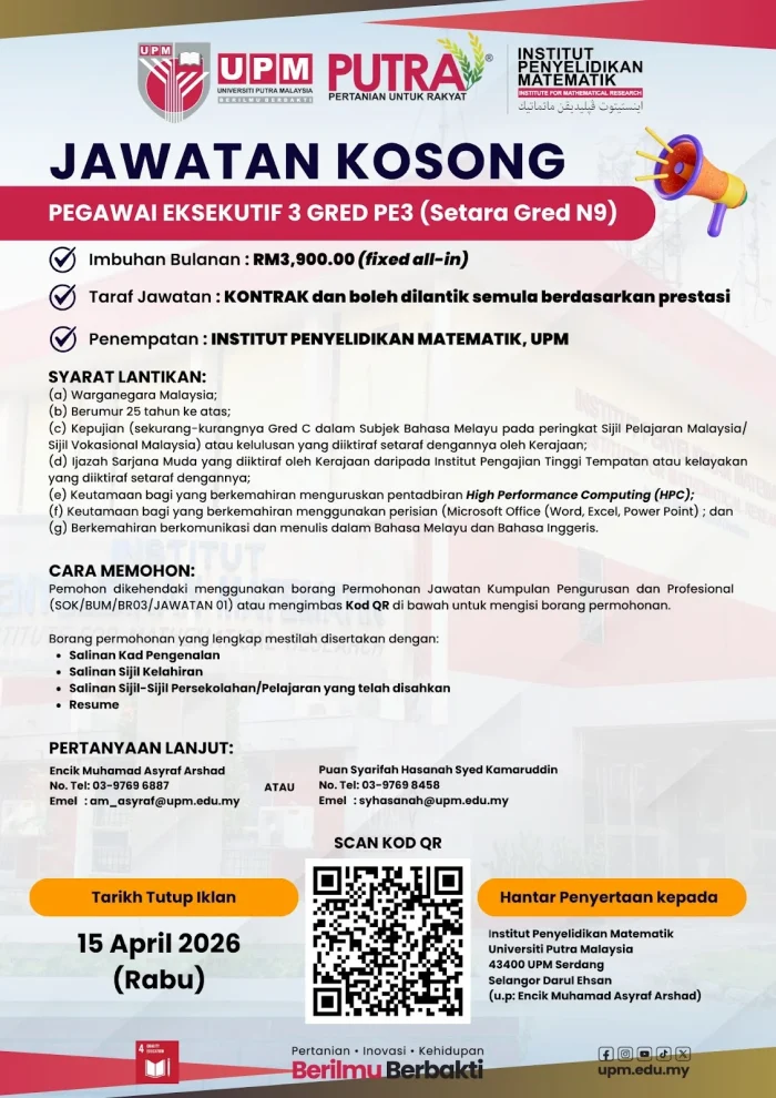 Institut Penyelidikan Matematik (INSPEM), Universiti Putra Malaysia (UPM) kini membuka peluang kerjaya kepada warganegara Malaysia yang berkelayakan untuk mengisi jawatan Pegawai Eksekutif 3 (Gred PE3) yang dinyatakan setara dengan Gred N9. Peluang ini amat sesuai kepada calon yang ingin membina kerjaya dalam bidang pentadbiran profesional, pengurusan operasi, serta persekitaran kerja berasaskan akademik dan penyelidikan di institusi pengajian tinggi terkemuka negara.