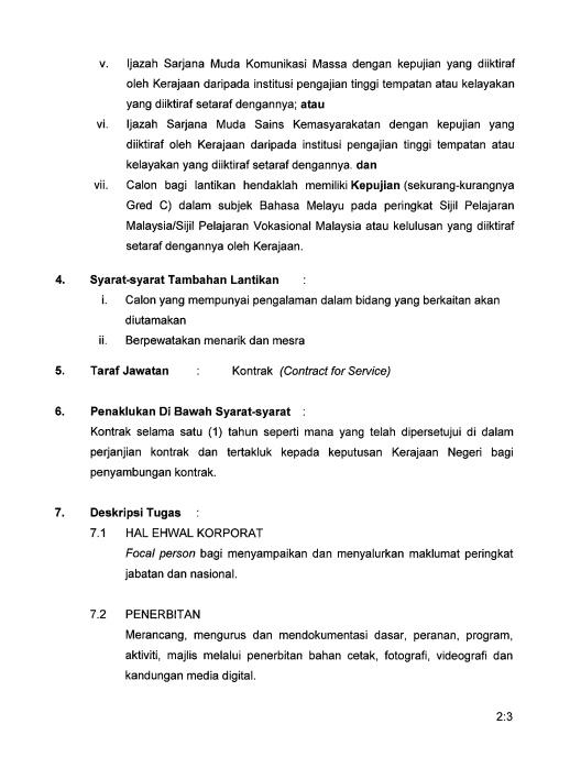 - Calon bagi lantikan hendaklah memiliki Kelujian (sekurang-kurangnya Gred C) dalam subjek Bahasa Melayu pada peringkat Sijil Pelajaran Malaysia/Sijil Pelajaran Vokasional Malaysia atau kelulusan yang diiktiraf setaraf dengannya oleh Kerajaan.