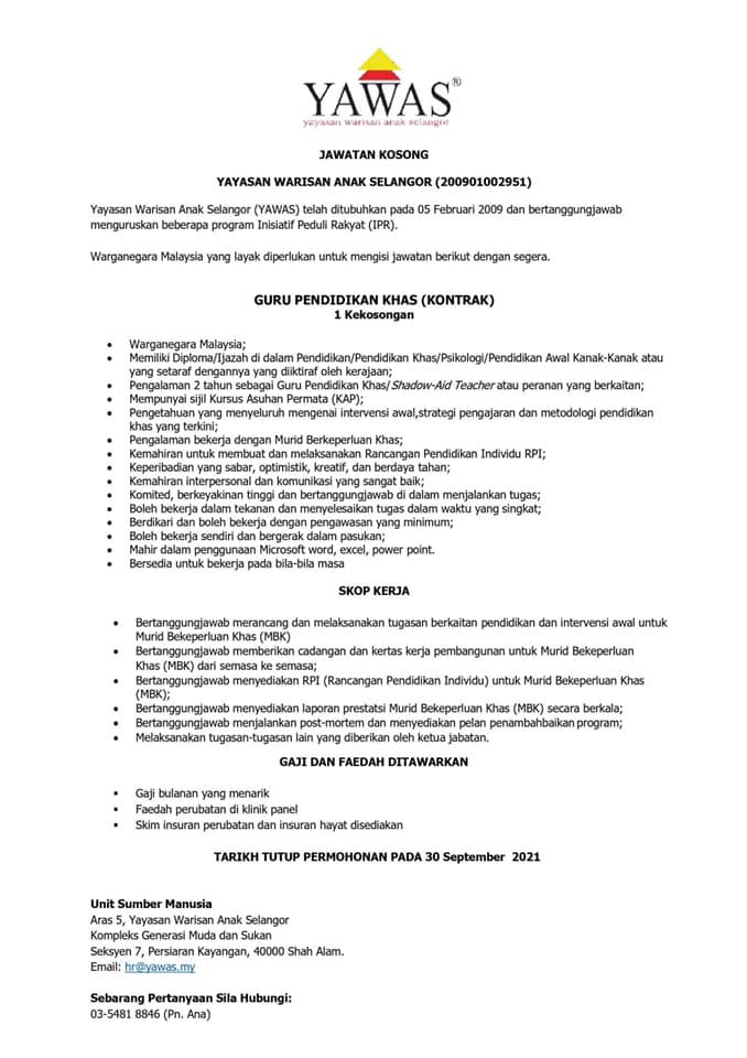 Yayasan Warisan Anak Selangor (YAWAS) mempelawa warganegara Malaysia yang berkelayakan untuk menyertai mereka dengan mengisi 3 jawatan kosong di YAWAS.