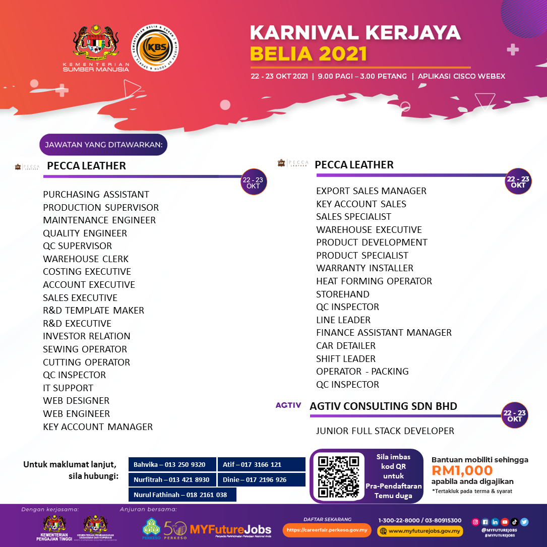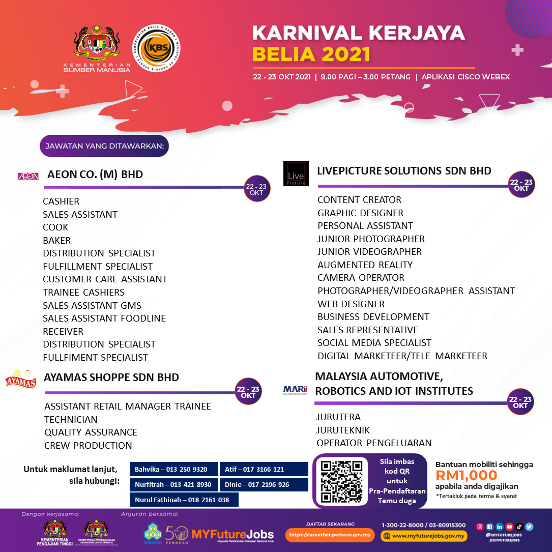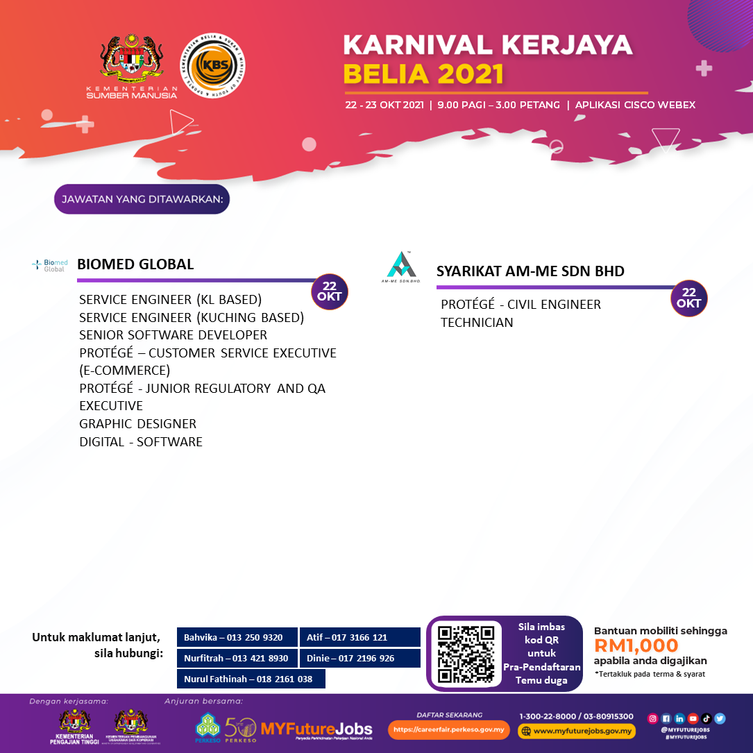 Sebarang maklumat lanjut dan pertanyaan mengenai Karnival Kerjaya Belia 2021 sila dapatkan di: