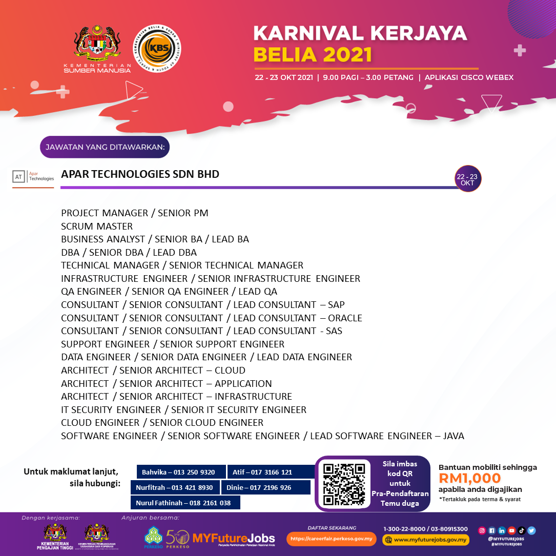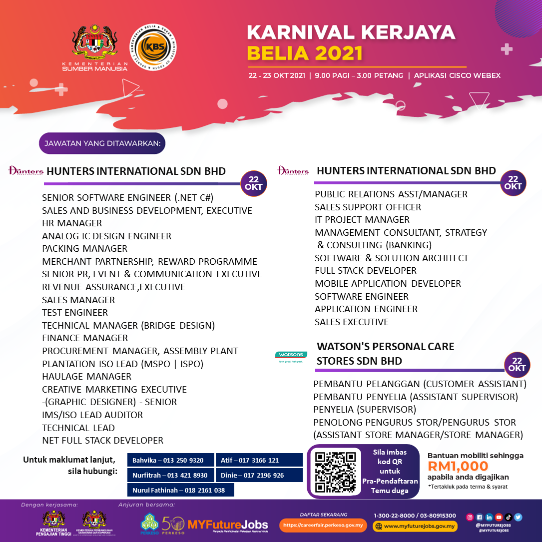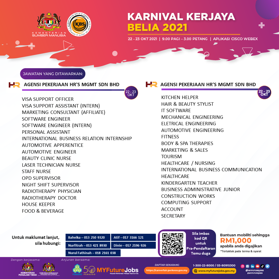 Sebarang maklumat lanjut dan pertanyaan mengenai Karnival Kerjaya Belia 2021 sila dapatkan di: