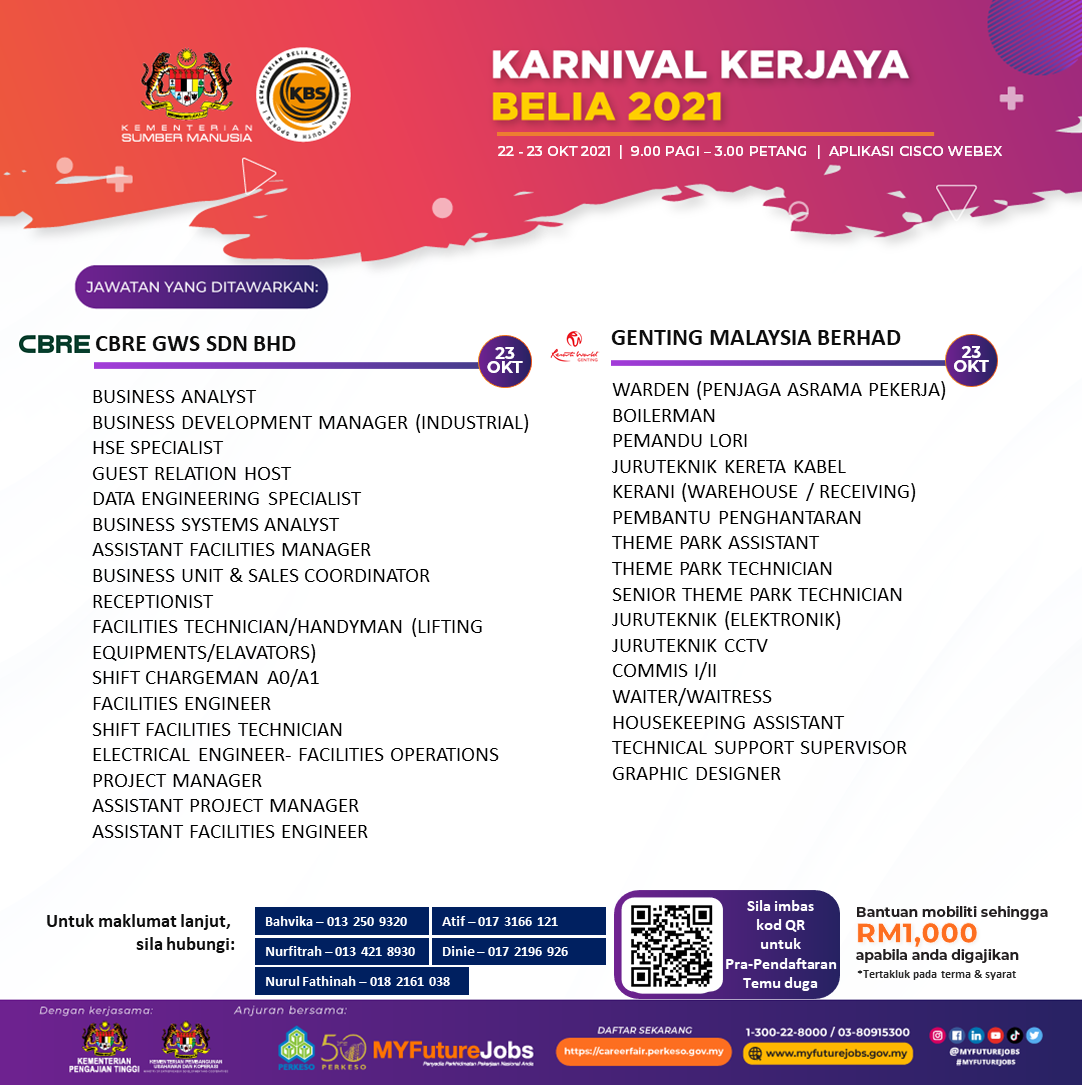 Karnival Kerjaya Belia 2021 akan diadakan mengikut tarikh berikut: