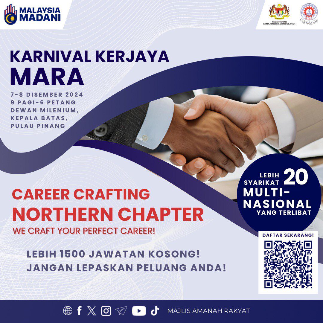 Jika anda sedang mencari peluang pekerjaan, berita baik menanti anda! Karnival Kerjaya MARA 2024 bakal berlangsung di Dewan Milenium, Kepala Batas, Pulau Pinang pada 7 dan 8 Disember 2024, bermula 9 pagi hingga 6 petang. Dengan lebih 1,500 jawatan kosong yang ditawarkan dan penyertaan lebih daripada 20 syarikat multinasional, ini adalah peluang terbaik untuk anda melangkah ke tahun baharu dengan kerjaya yang lebih cemerlang!