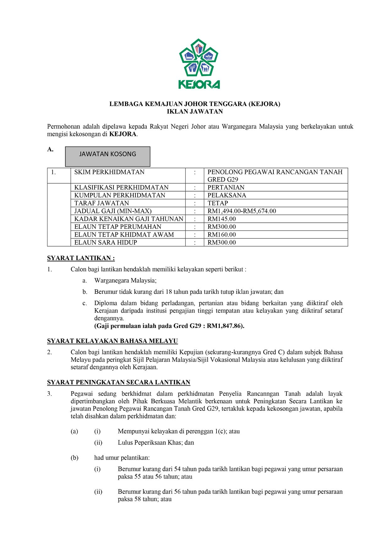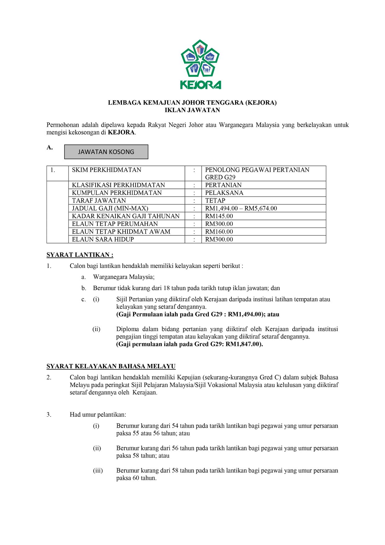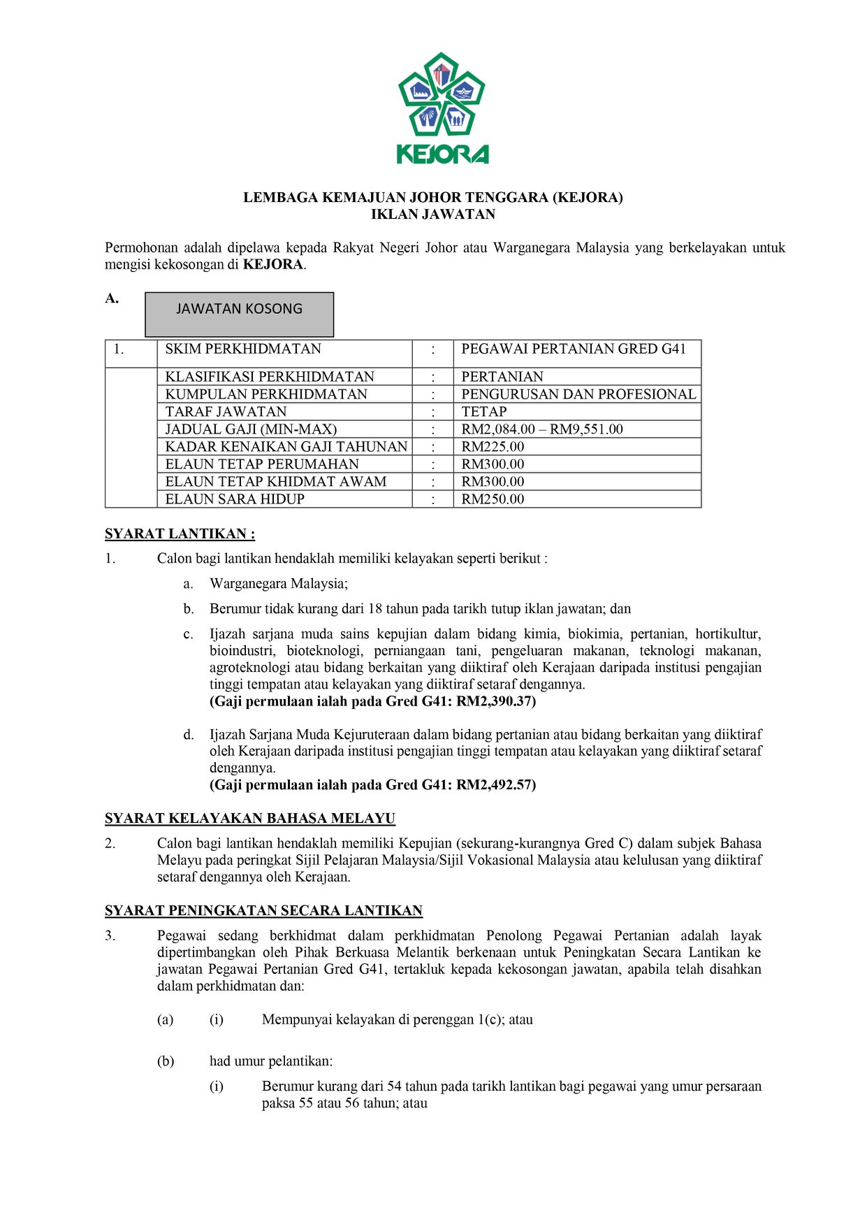 Jika anda ingin mendapatkan pekerjaan dengan jawatan tetap, sila buat permohonan kerja di Lembaga Kemajuan Johor Tenggara (KEJORA) dengan segera sebelum 20 April ini.