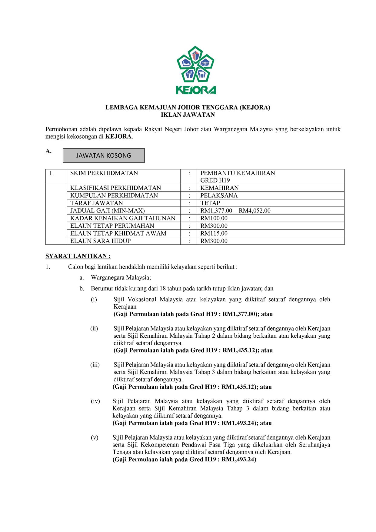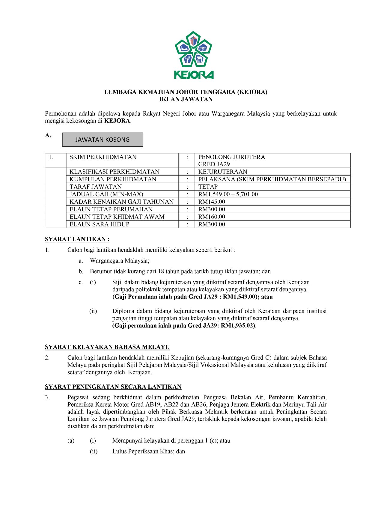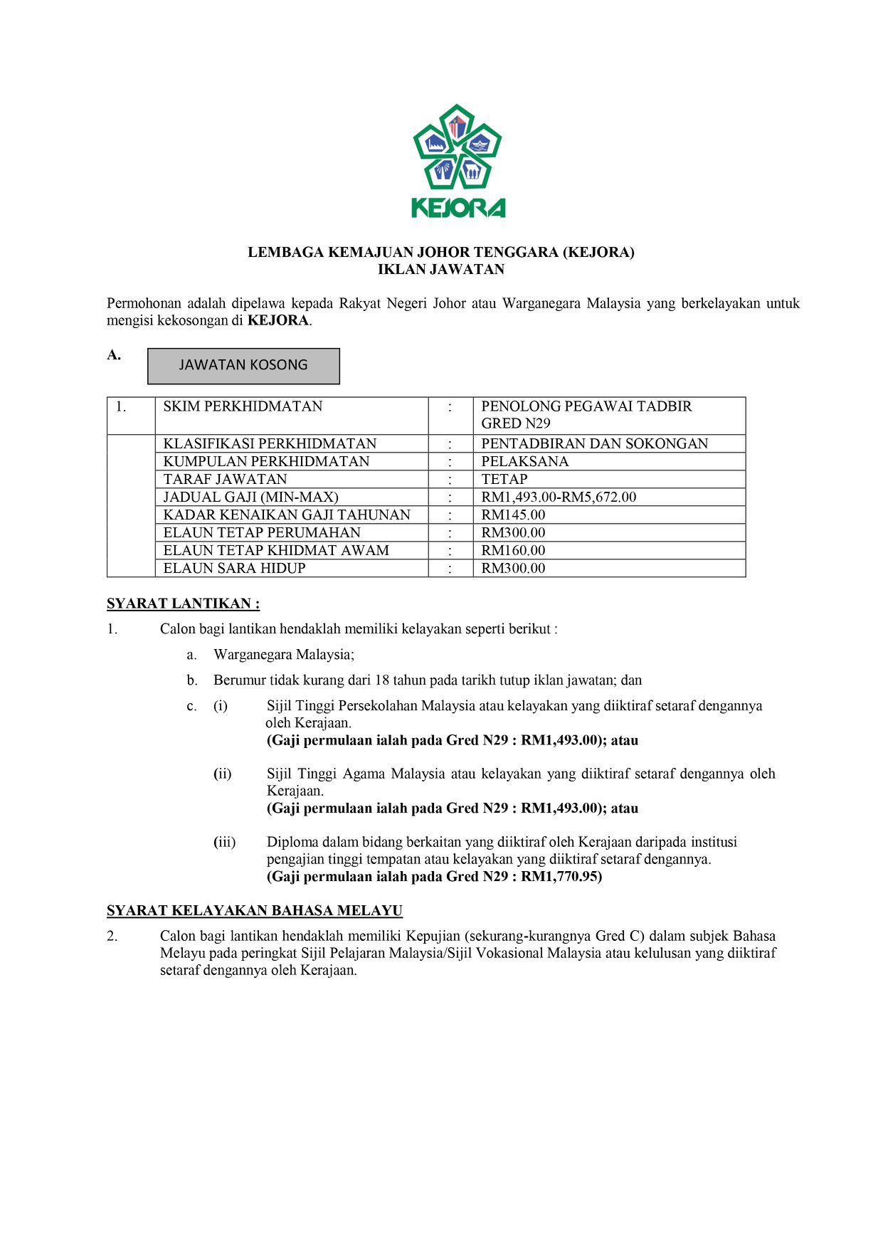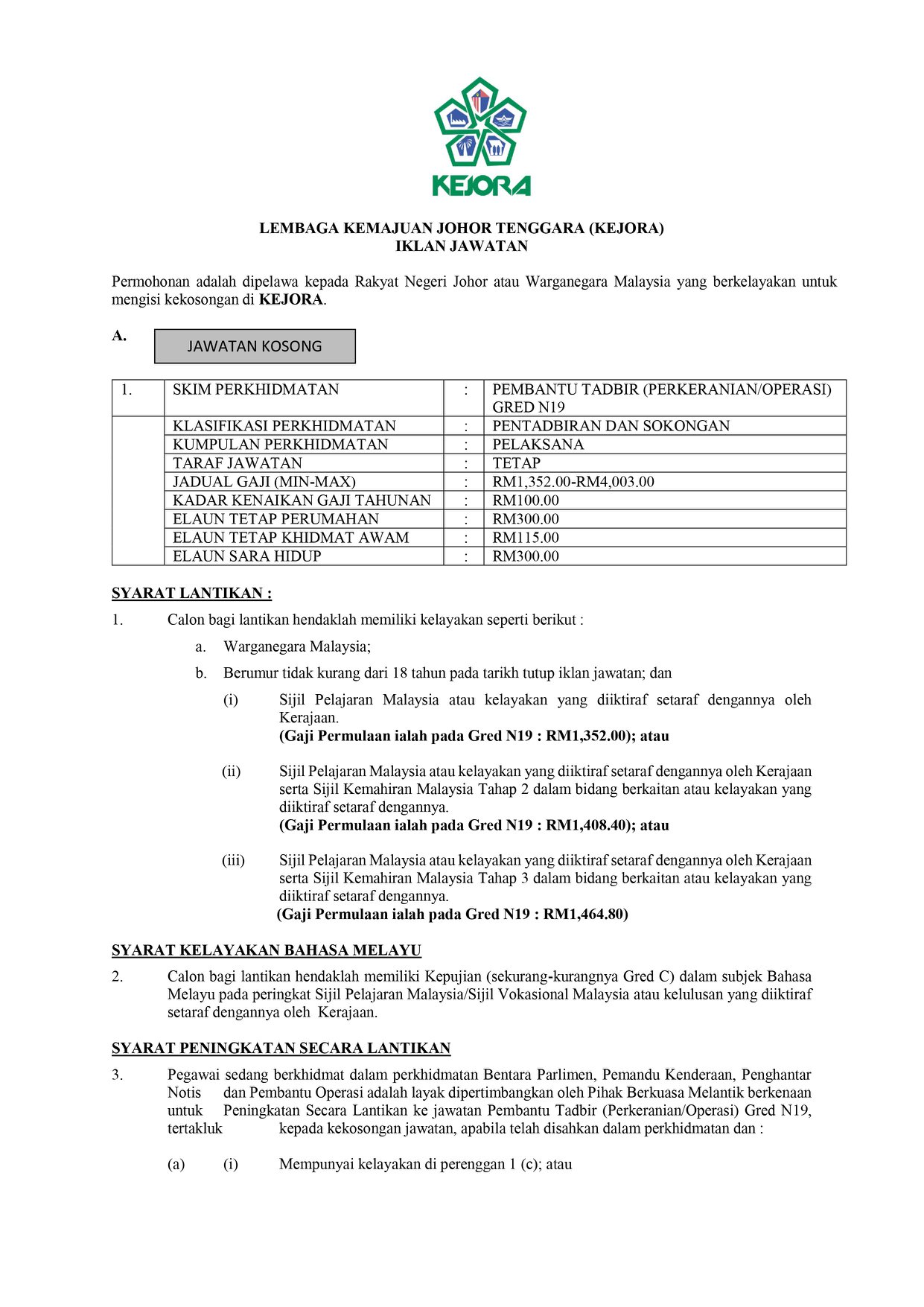 Jika anda ingin mendapatkan pekerjaan dengan jawatan tetap, sila buat permohonan kerja di Lembaga Kemajuan Johor Tenggara (KEJORA) dengan segera sebelum 20 April ini.