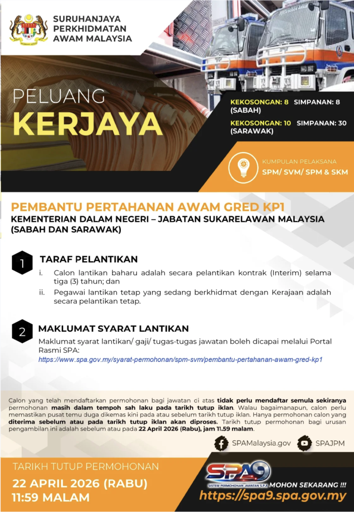 - Tarikh tutup: 27 April 2026 (11.59 malam)
