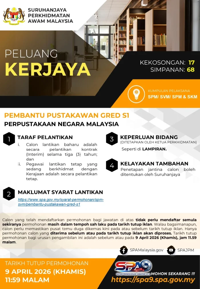 Iklan semasa melibatkan Perpustakaan Negara Malaysia dan permohonan ditutup pada 9 April 2026, jam 11.59 malam.