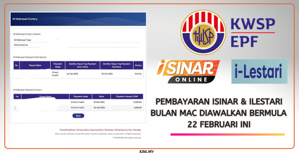 Kumpulan Wang Simpanan Pekerja (KWSP) telah membuat pembayaran iSinar dan iLestari lebih awal bagi bulan Mac kepada penerima mengikut peringkat bermula 22 Februari 2021.