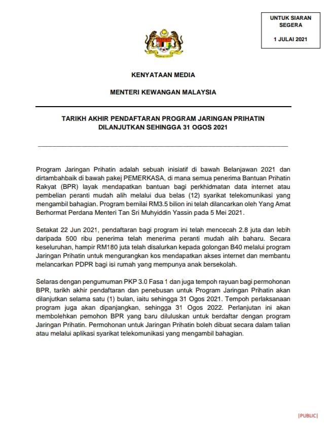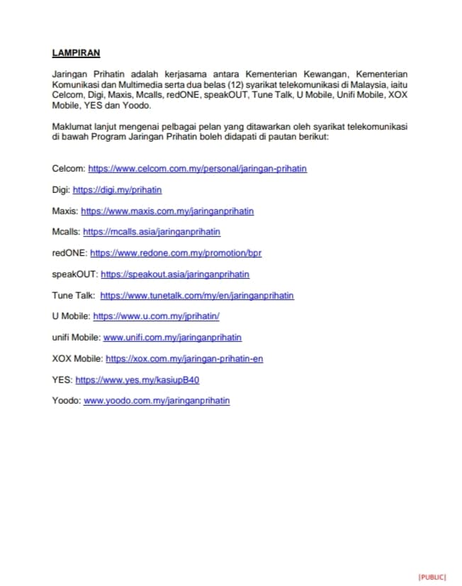 Untuk pengetahuan anda, Program Jaringan Prihatin adalah kerjasama antara Kementerian Kewangan, Kementerian Komunikasi dan Multimedia serta 12 syarikat telekomunikasi di Malaysia, iaitu Celcom, Digi, Maxis, Mcalls, redONE, speakOUT, Tune Talk, U Mobile, unifi Mobile, XOX Mobile, YES dan Yoodo.