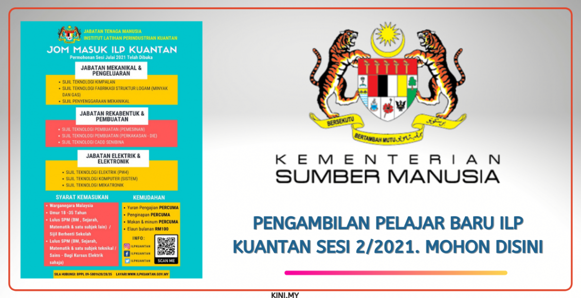 Institut Latihan Perindustrian (ILP) Kuantan melalui Jabatan Tenaga Manusia membuat pengambilan pelajar baru bagi Sesi 2/2021 dan permohonan adalah secara online sahaja.