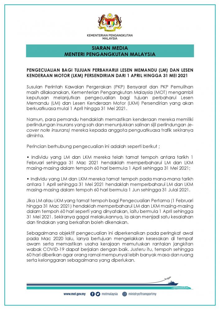 - Namun lesen memandu dan roadtax yang tamat tempoh bagi Pengecualian Pertama (1 Februari hingga 31 Mac 2021) ia perlu diperbaharui dalam tempoh 60 hari seperti yang dinyatakan, iaitu bermula 1 April sehingga 31 Mei 2021.