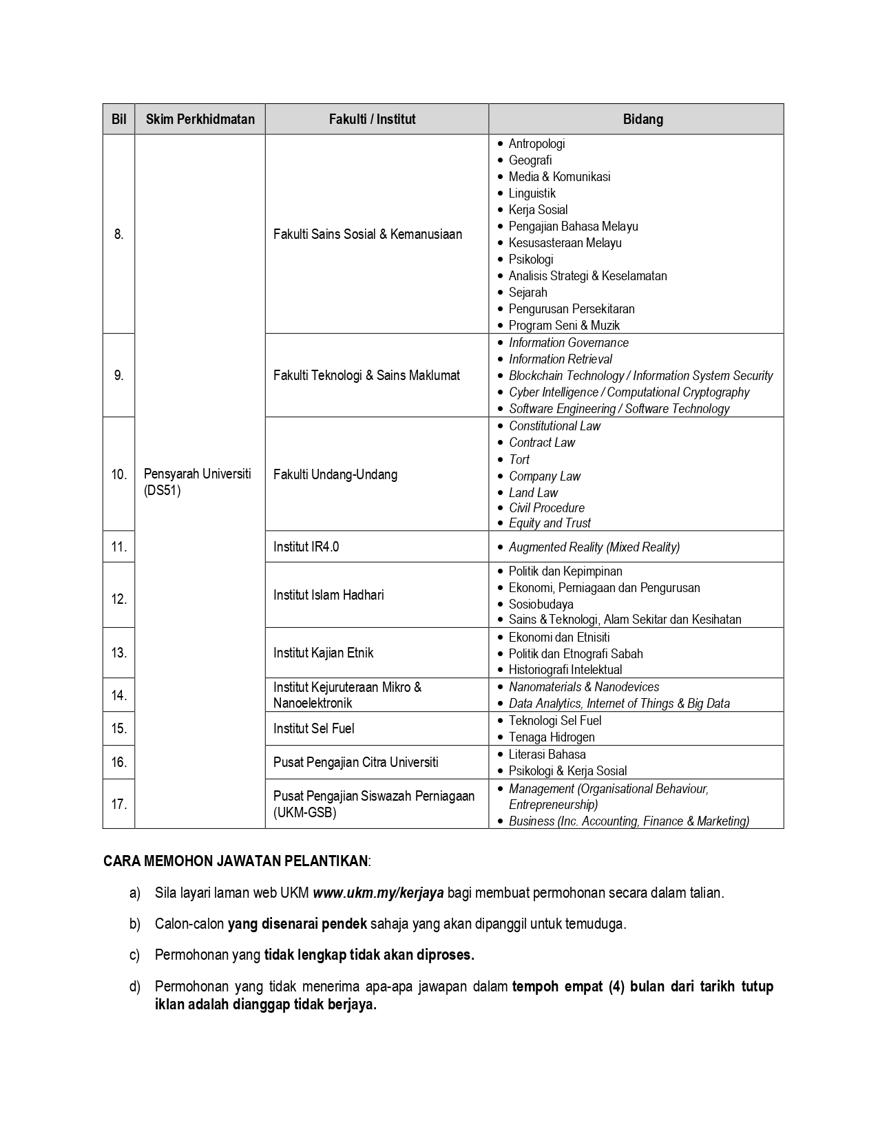 Terdapat 2 jenis kekosongan jawatan yang ditawarkan oleh UKM iaitu: