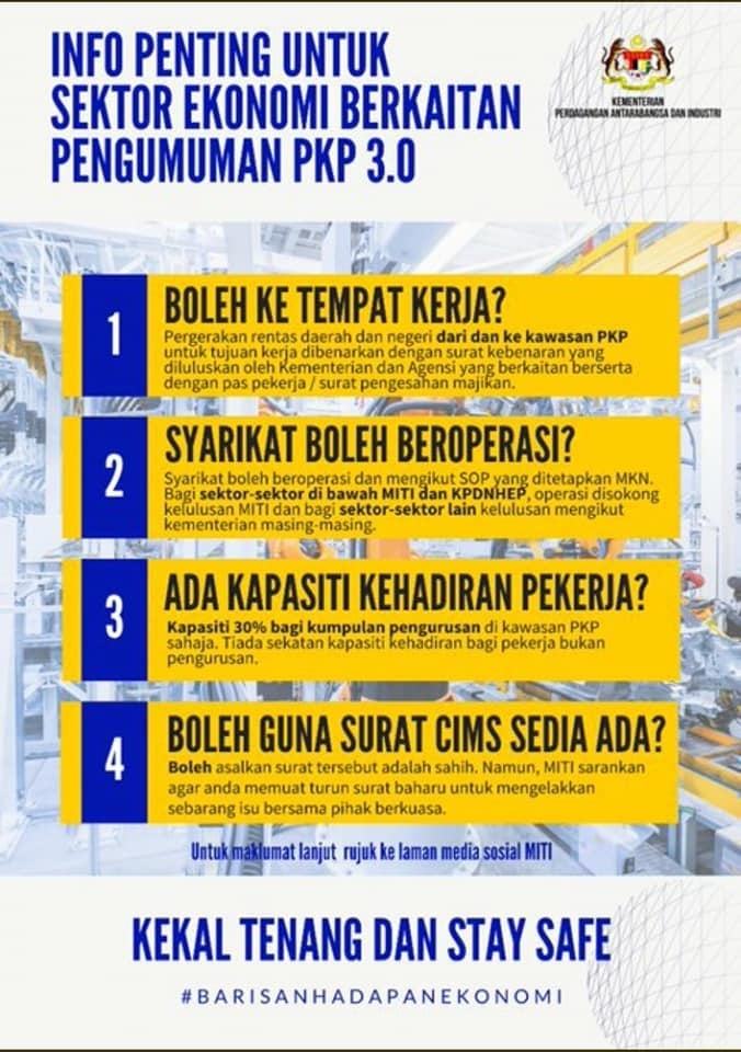 Perkara ini telah dimaklumkan oleh Kementerian Perdagangan Antarabangsa dan Industri (MITI) bahawa pergerakan rentas daerah atau negeri bagi tujuan kerja tidak memerlukan surat kebenaran Polis Diraja Malaysia (PDRM).