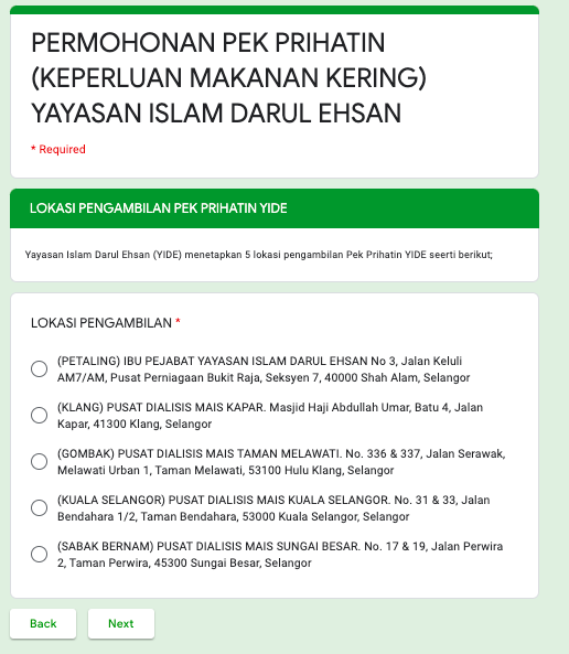 Terdapat 5 lokasi pengambilan barang-barang tersebut dan akan dimaklumkan kepada penerima melalui sistem pesanan ringkas sekiranya layak menerima sumbangan ini.