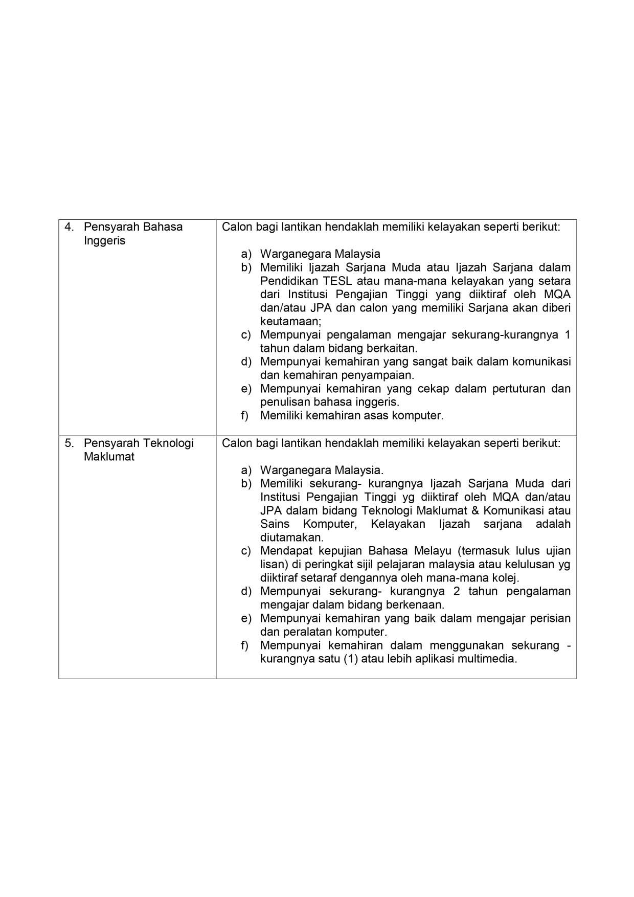 - Mempunyai sekurang- kurangnya 2 tahun pengalaman mengajar dalam bidang berkenaan.