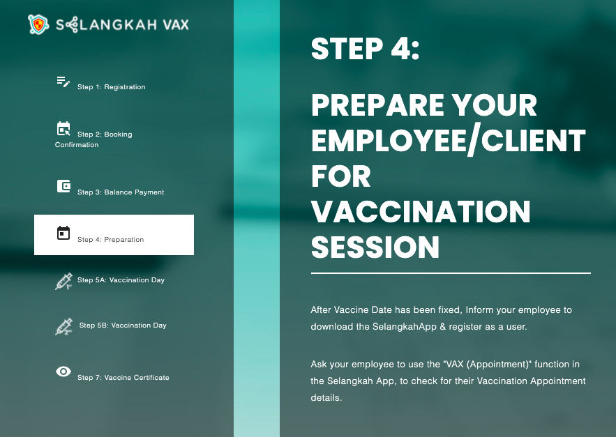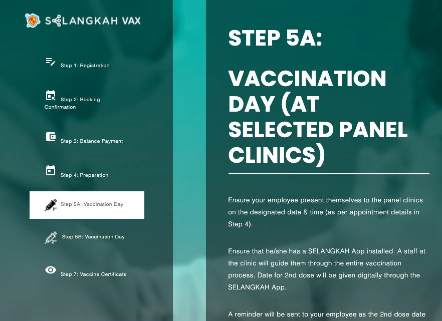 - Bagi pekerja yang ramai pula, proses vaksinasi akan dilakukan ditempat kerja masing-masing atau harus hadir ke Pusat Pemberian Vaksin (PPV) yang terpilih.