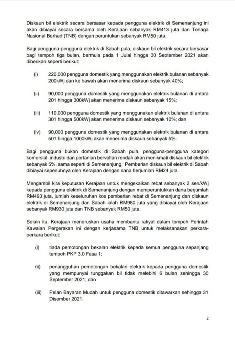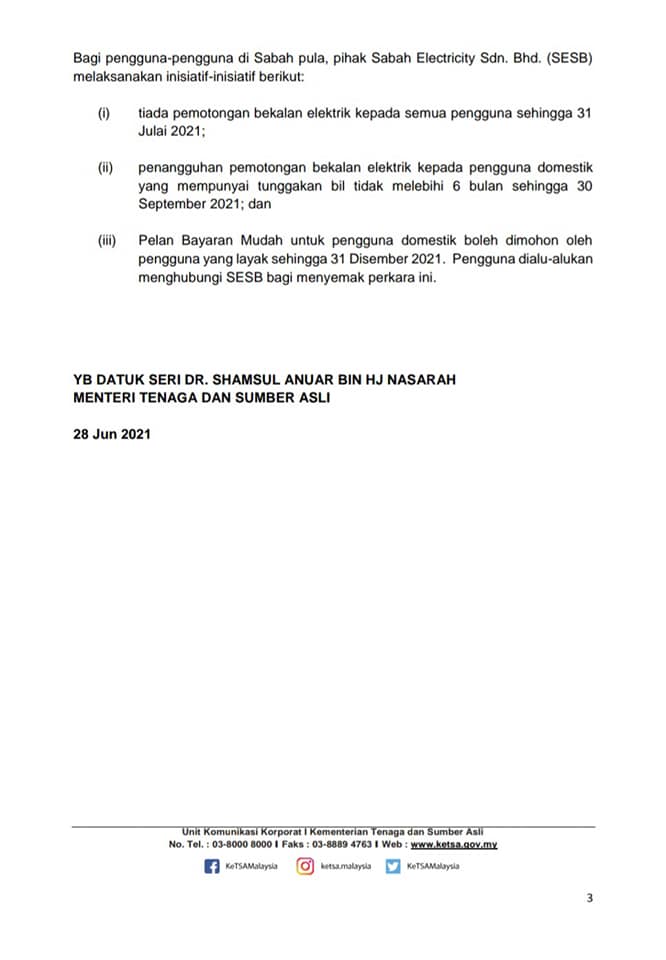 - Tiada pemotongan bekalan elektrik kepada semua pengguna sehingga 31 Julai 2021.