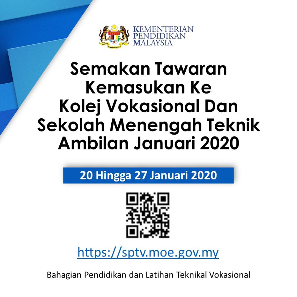 Pelajar yang membuat permohonan kemasukan ke Program Kolej Vokasional (KV) dan Sekolah Menengah Teknik (SMT) bagi sesi pengambilan tahun 2020 boleh membuat semakan status permohonan secara online bermula 20 Januari 2020 ini.