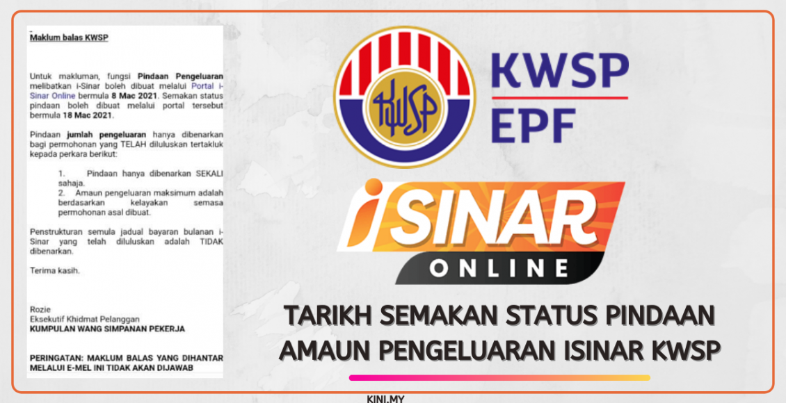 Semakan status yang boleh dibuat bermula 18 Mac 2021 adalah melalui Portal iSinar secara online sahaja. Sebelum ini, ramai pemohon membuat pindaan terutamanya amaun pengeluaran setelah boleh berbuat demikian pada 8 Mac 2021 yang lalu.