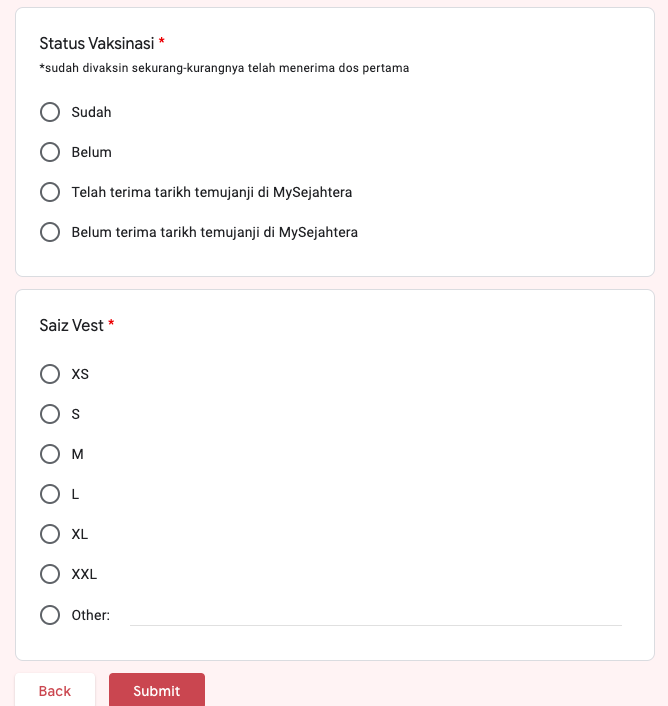 - Kit Sukarelawan seperti Vest, Fabric Mask, Medical glove, PPE