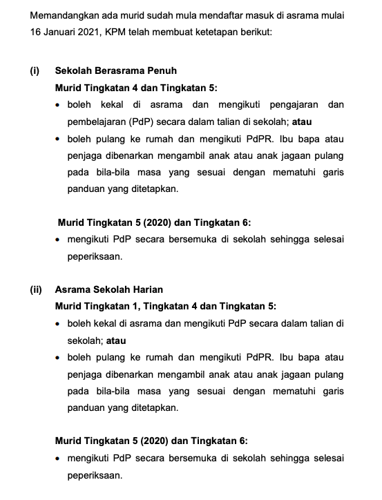 - Pelajar sekolah asrama penuh dan asrama sekolah harian yang akan menduduki peperiksaan dibenarkan pulang ke asrama mulai 16 Januari 2021 dan akan diberikan surat kebenaran khas yang dikeluarkan oleh pihak sekolah bagi membolehkan pelajar merentas negeri untuk pulang ke asrama.