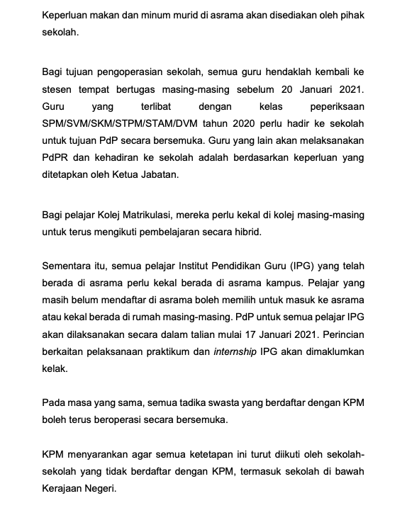 - Bagi pelajar Kolej Matrikulasi, pelajar yang telah berada di kolej perlu kekal di kolej masing-masing untuk mengikuti pembelajaran secara hibrid. Manakala pelajar Institusi Pendidikan Guru (IPG), semua program pengajian secara online mulai 17 Januari 2021.