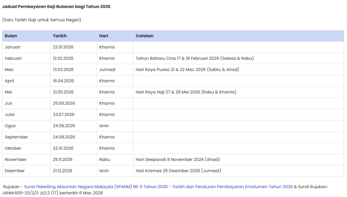 Rujukan Rasmi Tarikh Gaji Penjawat Awam 2026