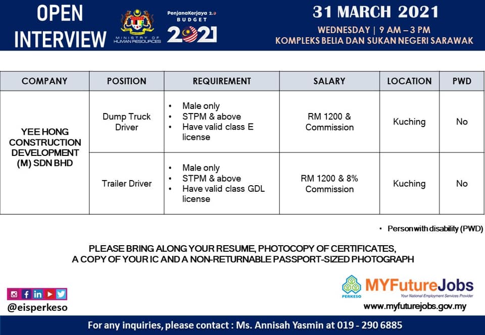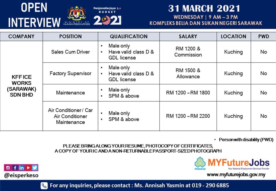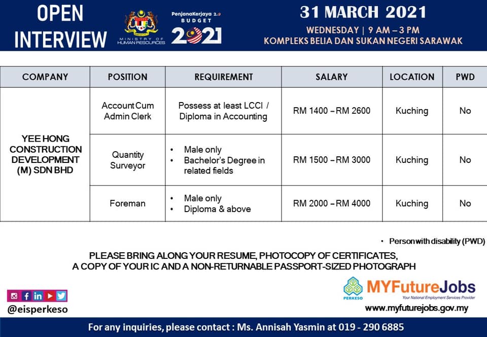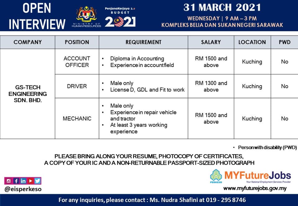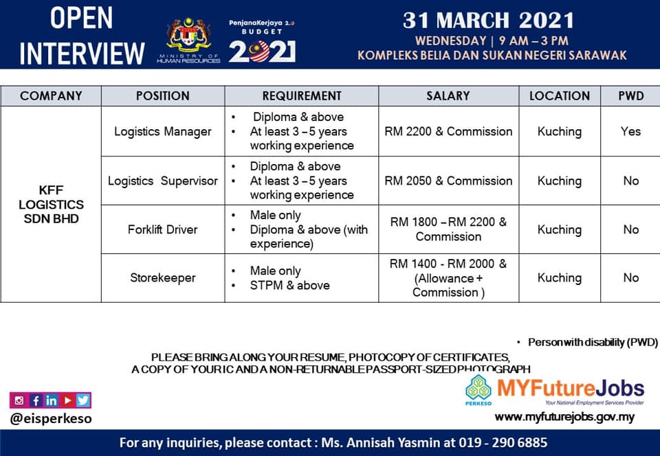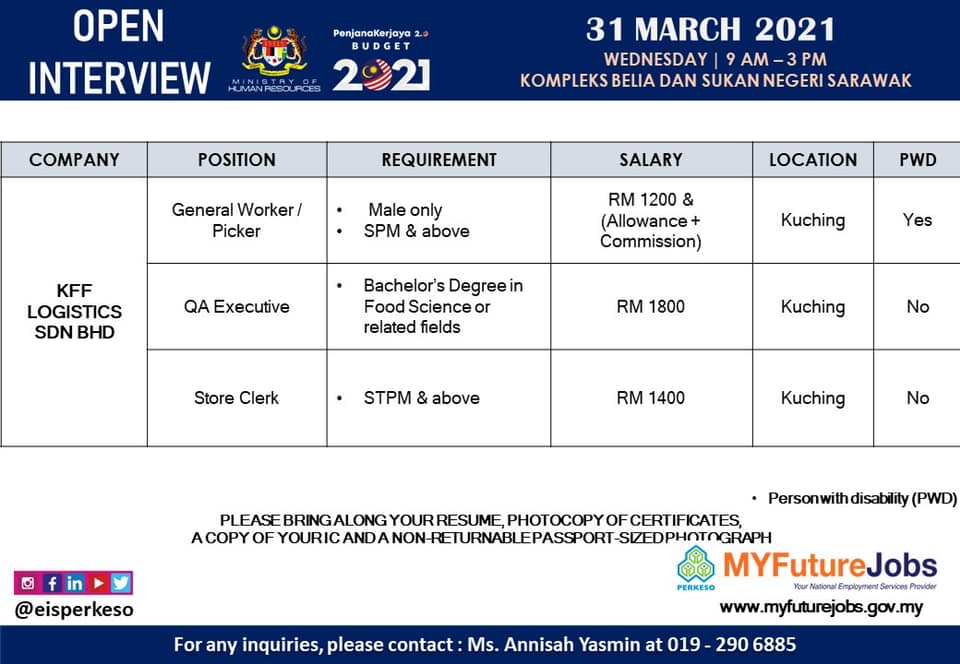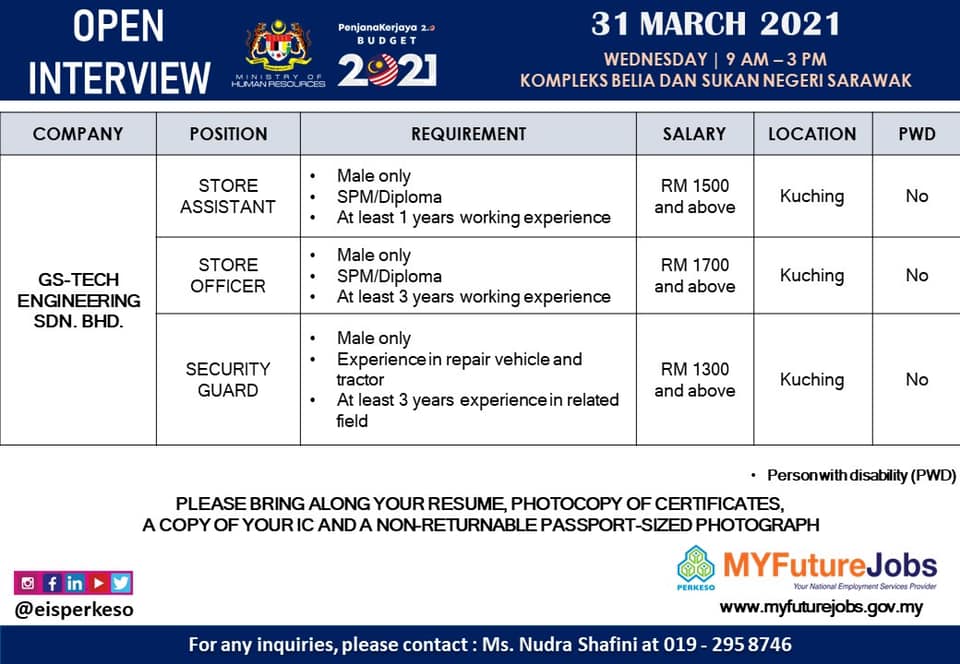 Sebarang maklumat lanjut dan pertanyaan mengenai Temuduga Terbuka PERKESO Kuching, Sarawak, sila hubungi: