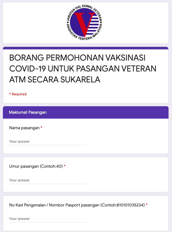 TEMPOH PERMOHONAN VAKSINASI COVID-19 UNTUK PASANGAN VETERAN ATM SECARA SUKARELA