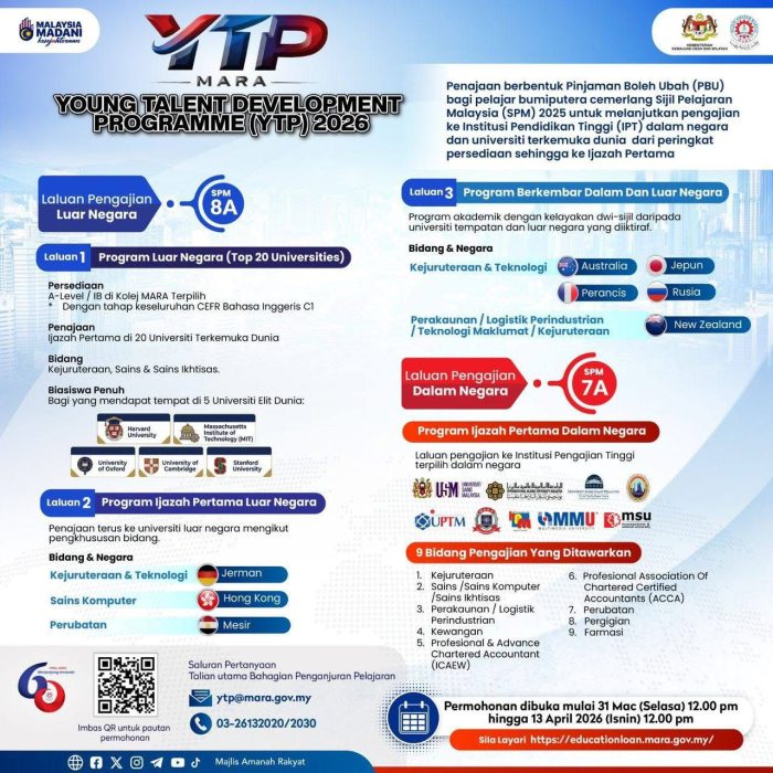 YTP MARA 2026 ialah tajaan pendidikan untuk lepasan SPM 2025 Bumiputera cemerlang. Permohonan dibuka dari 31 Mac 2026 hingga 13 April 2026. Secara umum, laluan dalam negara sekitar 7A, manakala laluan luar negara sekitar 8A, tertakluk kepada syarat program.